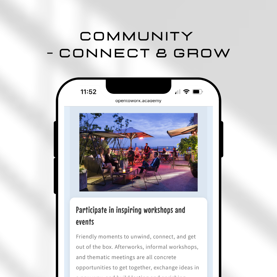 - Une communauté vivante et dynamique, rythmée par des événements, ateliers et afterworks, favorisant les échanges, la collaboration et le développement personnel comme professionnel.