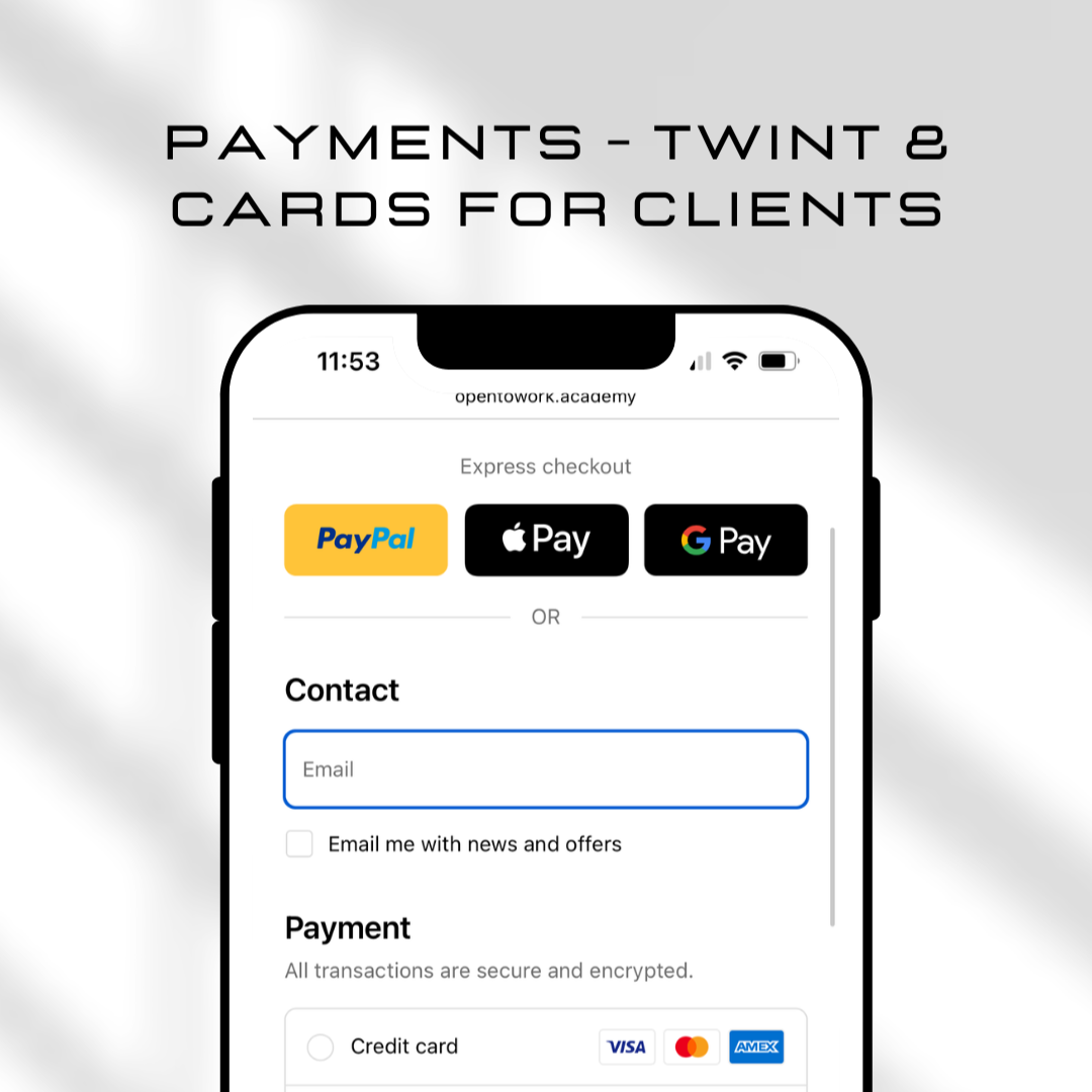 La plateforme gère les paiements sécurisés et simplifie la facturation. Les services (Twint, Mastercard, etc.) sont pris en charge par l’Académie.